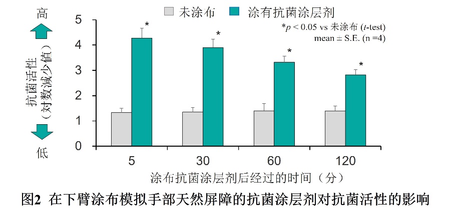●模拟手部天然屏障的抗菌涂层剂在人体皮肤上经过2小时后仍能发挥效果