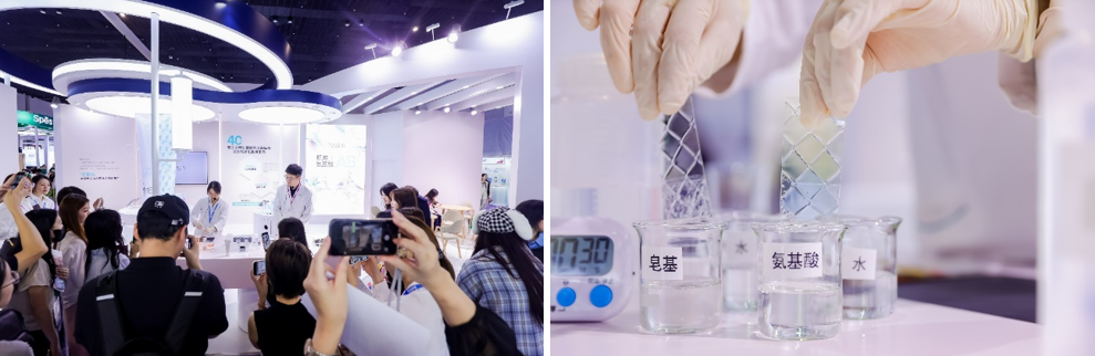 芙丽芳丝通过可视化、可互动的方式,将专业科研内容转化为观众易于感知的体验。在现场特别设置的实验互动区,由花王研发专家演示“高浓度氨基酸蛋白反应”“赤岩火山泥吸附油脂”“卸妆油秒速溶妆”等实验,为参观者直观呈现氨基酸系产品的技术优势与清洁效能。